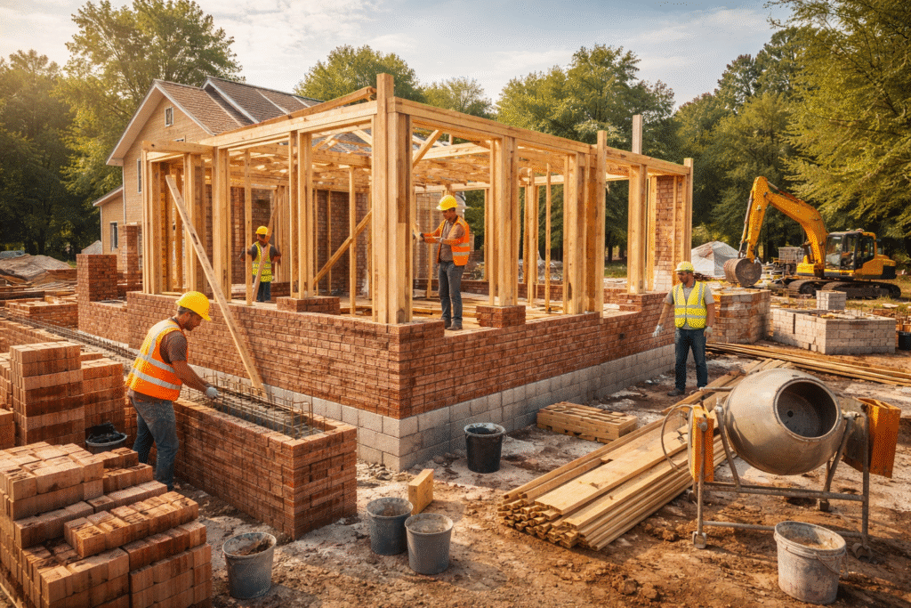 يتم تنفيذ جميع مراحل البناء بدقة، بدءًا من الحفر والهيكل الخرساني وصولاً إلى التشطيبات النهائية. يشرف فريقنا على العمل وفق خطط واضحة لضمان جودة المنشآت واستقرارها على المدى الطويل.